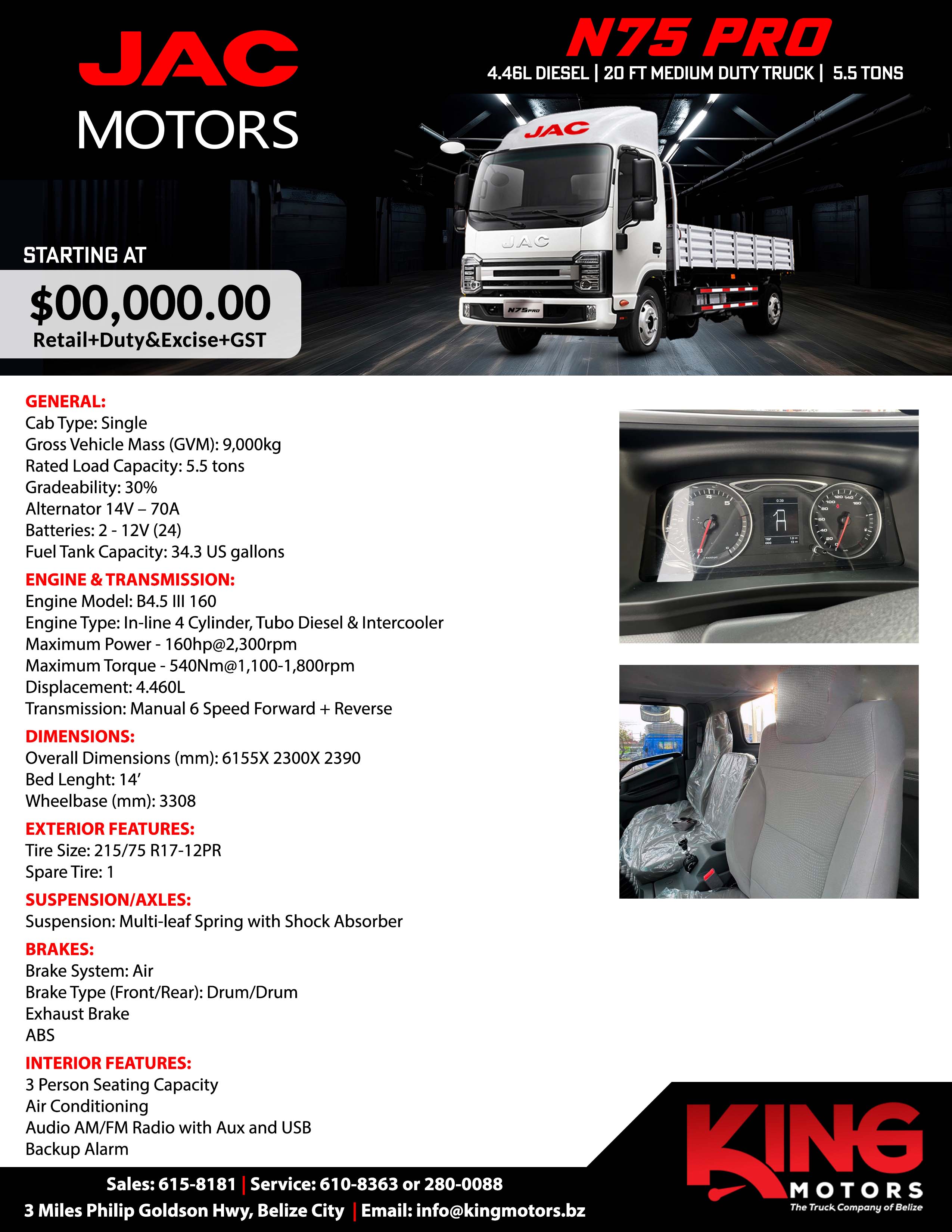 The JAC N75 PRO is a medium-duty truck designed for businesses that need strength, reliability, and efficiency. Powered by a 4.46L turbo diesel engine delivering 160hp and 540Nm of torque, it offers excellent hauling capability with a rated load capacity of 5.5 tons and a 20 ft bed. Its 6-speed manual transmission, air brake system with ABS, and exhaust brake provide control and safety, while the multi-leaf spring suspension ensures stability under heavy loads. With seating for three, air conditioning, AM/FM radio with Aux and USB, and a backup alarm, the N75 PRO combines rugged performance with practical comfort to keep your business moving forward.